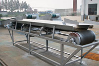 該輸送機主要由輸送帶、驅(qū)動裝置、傳動滾筒、托輥及機架等部件組成。